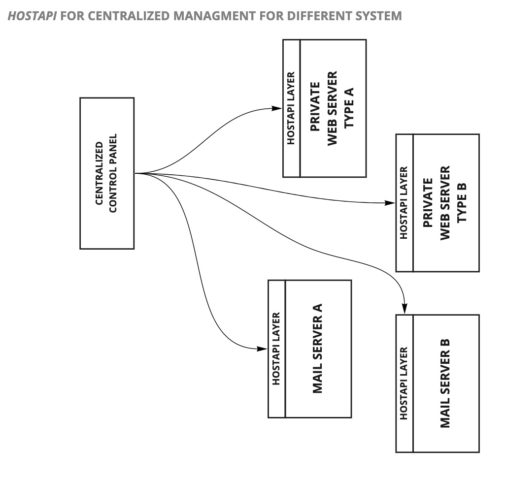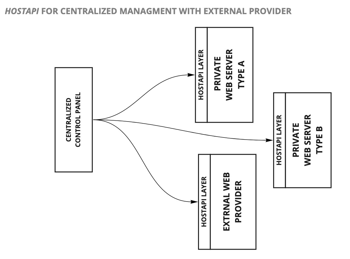 Hostapi is a standard which can be adopted by hosting panel producers for products like Plesk, cPanel, ispConfig to help providers building integration between heterogeneous and multi-manufacturer systems.